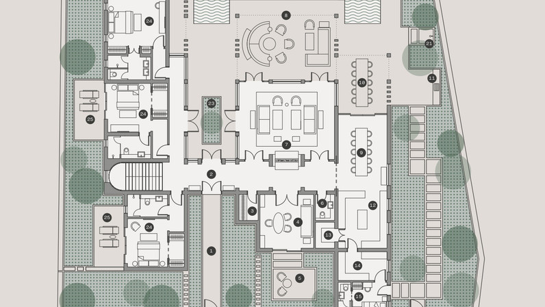 Arrival and utility: entrance courtyard, triple covered parking pergola, technical room, and EV‑charger provision.